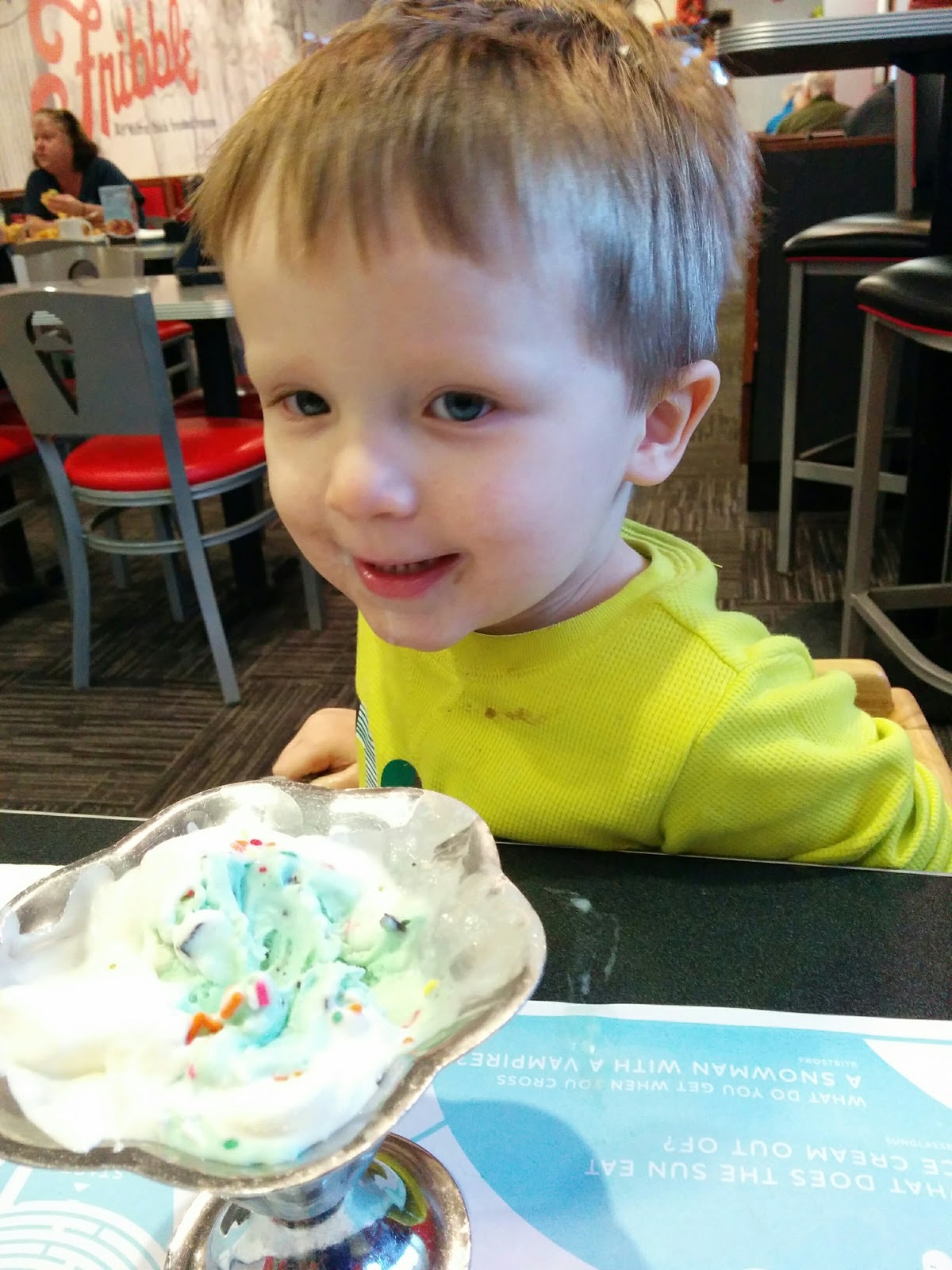 We set up in the icecream room with food and attempted to get Levi to eat. It was a lost cause! I had ordered him chicken nuggets and french fries and he barely touched them. I did finally get him to eat a yogurt tube, and about two fries.