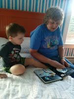 The next morning Levi was awake around 6:30. He played on his tablet for a little while and then we all get dressed and headed downstairs for breakfast. After breakfast we played at the train table and with the cars and lego's for a few before heading upstairs to put on button cream, pack up and head out. Grammie and Levi got in one more page in the space book while I was packing everything up.