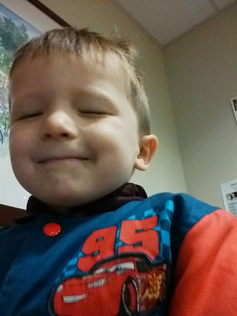 We headed over to the lab and there was a long line so we settled in to wait. We took some family Selfies and then Levi played games on my phone until it was his turn.