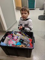Then he climbed up in the chair for the blood draw and to play on the tablet. He played PBS Kids and sent Daniel Tiger into outer space. The blood draw went super quick today and no problems at all. Then we were off to the treasure box. He really struggled to decide what he wanted today. But ended up with a red and blue truck.
