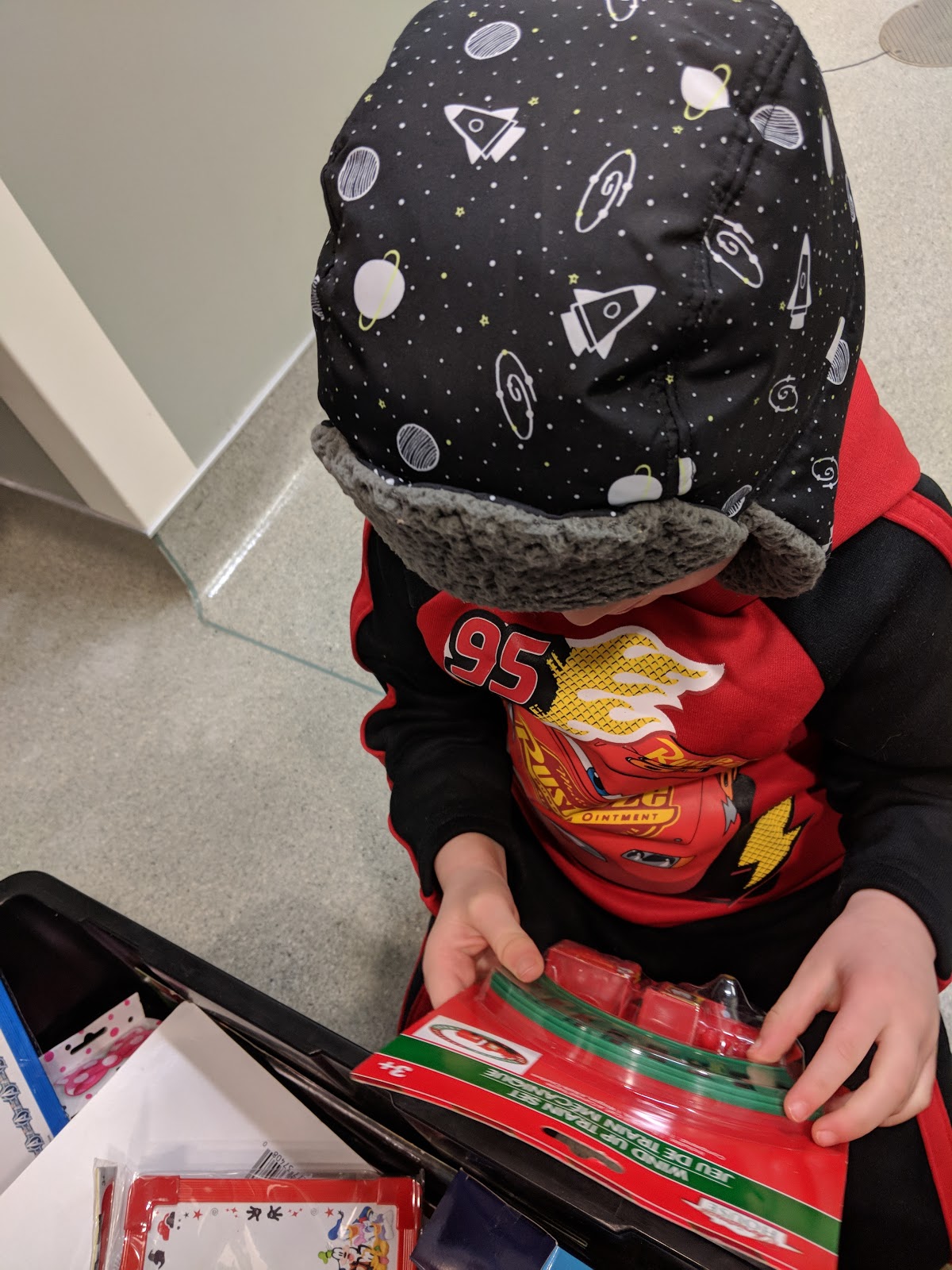 Then he climbed up in the chair and had an easy blood work! YAY! He needed an easy one after last time, and especially important this time as he needed three vials instead of two. Then he was off to the treasure box. He picked out a car that was in a box and wanted it open immediately, so P helped him open it. He gave his hugs and then drove his car out! He got a few chuckles from the ladies at registration.